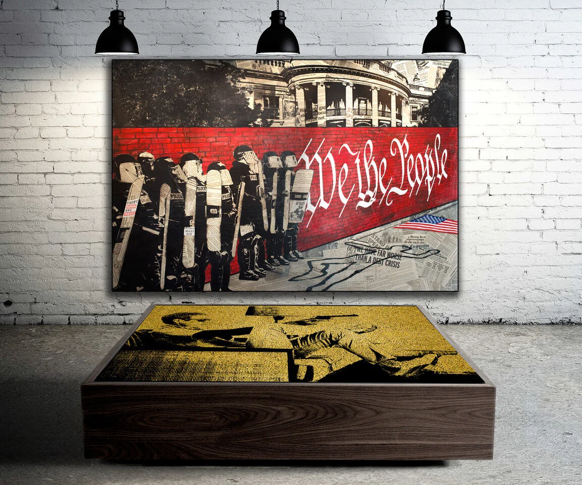 This quickly blossomed into a career in mixed-media, with materials like spray paint, acrylics, bullet shells, ink, stencils, needles, silk screens, bricks, concrete and various created methods of experimentation and play with found objects.